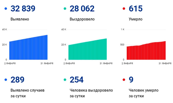 По информации, представленной на официальном портале стопкоронавирус.рф, за минувшие сутки на Вологодчине выявлено 289 заболевших. Таким образом, по состоянию на сегодня, 1 февраля, в регионе зафиксировано 32 839 подтвержденных случаев заражения COVID-19. И сейчас с недугом борются 4162 жителя области.