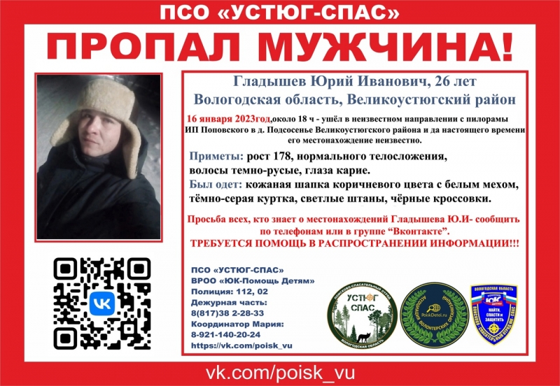 ПСО «Устюг-Спас» публикует приметы пропавшего. Ростом он 178 сантиметров, нормального телосложения, волосы темно-русые, глаза карие. Был одет в темно-серую куртку, светлые штаны, коричневую шапку с белым мехом, черные кроссовки.