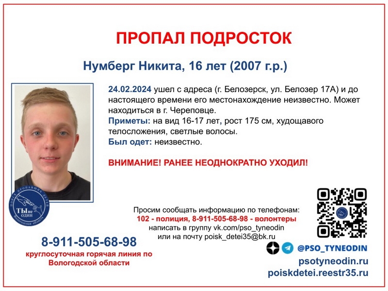 На вид Никите 16-17 лет, худощавый, светлые волосы. Сказать, во что он одет сложно, потому что за время его отсутствия погода сильно изменилась. По словам родных, подросток может быть в Череповце.