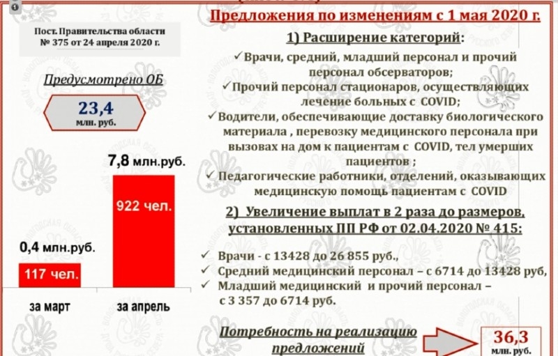 Олег Кувшинников согласился с предложением и обратился к департаменту финансов Вологодской области с просьбой изыскать необходимые средства. Дело в том, что для выполнения данной инициативы не хватает 12 миллионов. Дано поручение срочно найти средства и начать выплаты с 1 мая, сообщает ИА "СеверИнформ".