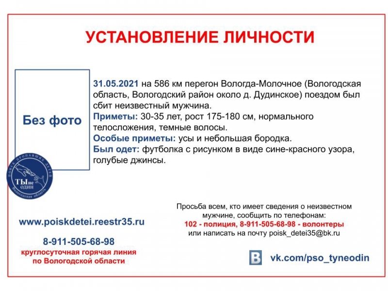 Несчастный случай произошел 31 мая на перегоне «Вологда – Молочное» неподалеку от деревни Дудинское. Требуется установить личность погибшего. Информацию распространяет ПСО «Ты не один».