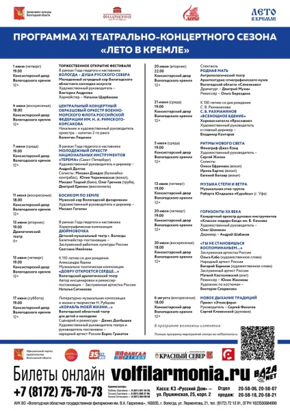 Торжественное открытие состоится 1 июня в 19 часов в Консисторском дворике Вологодского кремля. Уникальные исторические «декорации» ждут зрителей уже в 11 раз. В этом году под открытым небом состоится полтора десятка концертов и спектаклей. Посетители фестиваля насладятся этно-музыкой, выступлениями масштабных хоров и оркестров, популярных исполнителей, звезд театральной сцены.