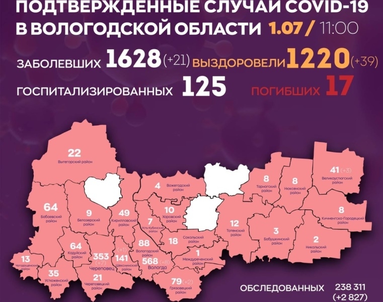Актуальная информация размещена на сайте правительства области. Весомый прирост вновь выдали центральные города региона: 8 случаев заболевания коронавирусом зафиксировано в Вологде, 7 – в Череповце. На спад пошла вспышка в Грязовецком районе – за сутки здесь всего два новых заболевших. А вот в Великоустюгском районе сразу трое жителей получили диагноз COVID-19. Один заболевший добавился в Шекснинском районе.