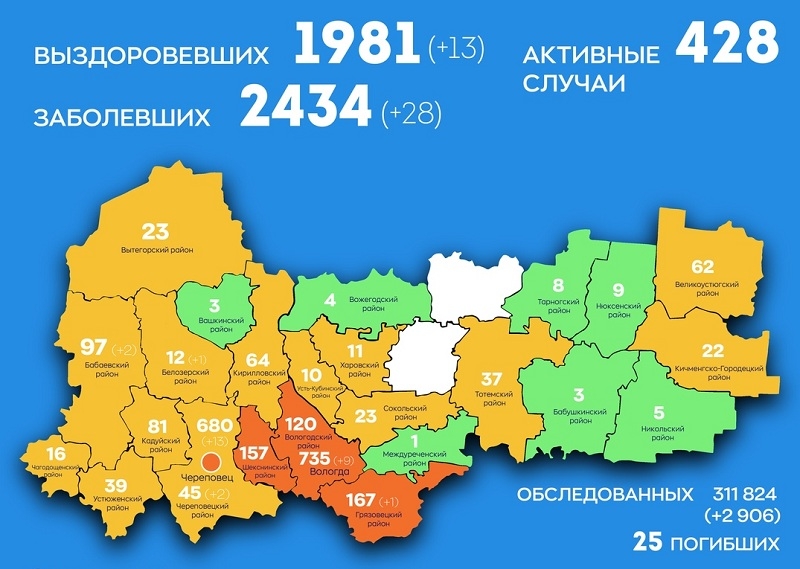 Всего на Вологодчине с начала пандемии заболели 2434 человек, из них 1981 выздоровел, 25 скончались. Обследованы на наличие COVID-19 более 311 тысяч человек, сообщает ИА «СеверИнформ».