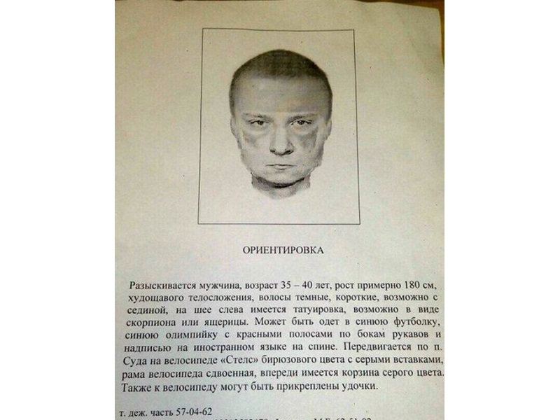 На вид разыскиваемому 35−40 лет, он ездит на велосипеде марки STELS, на который прикреплены удочки. Сообщается, что очевидцы не раз видели мужчину, подходящего под описание, вблизи детских площадок поселков Суда и Хохлово.