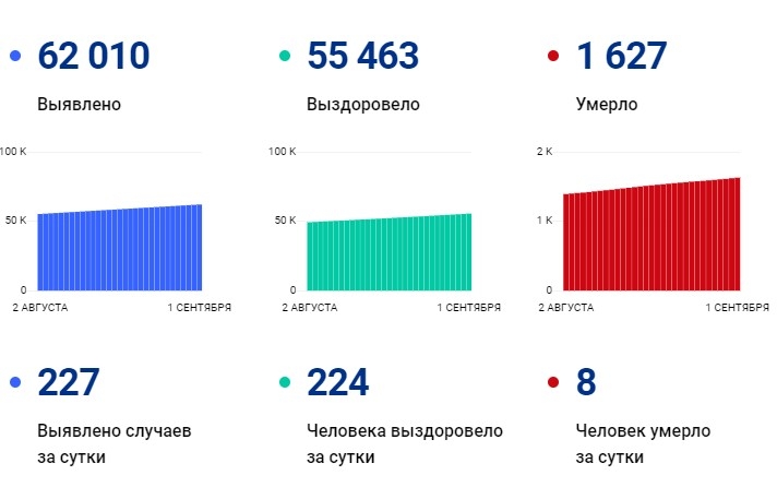Суточные приросты на протяжении последнего месяца стабильно держатся на уровне больше 220 новых случаев. Общее количество заболевших превысило 62 тысячи человек. Из них 55463 уже выздоровели, в том числе, за последние сутки – 224.