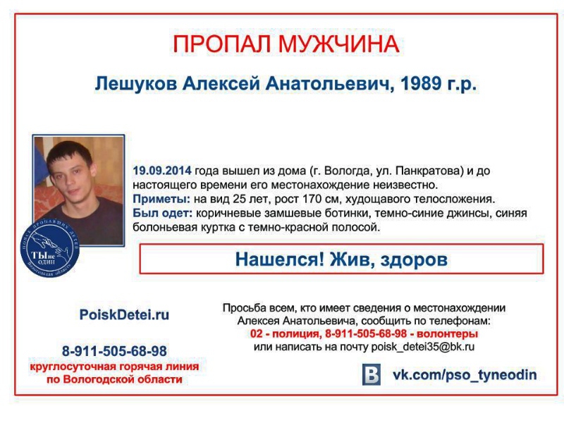 Напомним, 25-летний Алексей Лешуков пропал еще 19 сентября. Он ушел из дома по улице Панкратова областной столицы, и почти 2 недели о его местонахождении ничего не было известно. Поиском занимались сотрудники полиции и волонтеры.