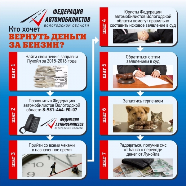 По закону обманутые люди могут обратиться в суд и вернуть деньги, потраченные на покупку топлива. Федерация автомобилистов Вологодской области предоставит бесплатного юриста, который поможет правильно составить все необходимые для этого документы.