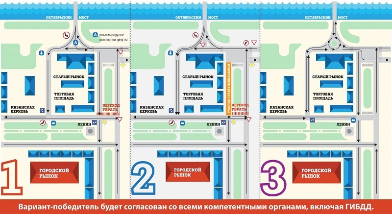 Вариант № 2 предполагает следующую схему движения: при съезде с моста в сторону центра транспорт повернет направо, съезд налево запрещен для всех видов транспорта. До пересечения с проспектом Победы движение по Торговой площади сделают односторонним, а движение по проспекту Победы до улицы Мира – двусторонним (см. фото).