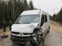 ДТП случилось в десятом часу утра в субботу, 1 ноября, на 22 километре автодороги Кадуй-Марыгино, рядом с поселком Зеленый берег. Микроавтобус "Renault" столкнулся с машиной "УАЗ". По предварительной версии следствия, микроавтобус, которым управлял 47-летний мужчина, выехал на встречную полосу, что и стало причиной аварии.