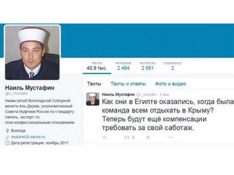 «Вчера, то есть 31 октября 2015 года от имени имама Вологодской Соборной мечети Наиль-хазрата Мустафина в его аккаунте в твиттере кто-то высказал, якобы его оценку людям, погибшим в авиакатастрофе над Египтом. Внутреннее расследование Совета мусульманской общины г. Вологды показало, что действительно какой-то провокатор, с целью дискредитации мусульманской Уммы России, вскрыл пароль и написал сообщение, порочащее доброе имя имама мечети», - написал в письме Руководитель мусульманской общины, член Общественной палаты Вологодской области Равиль хазрат Мустафин.