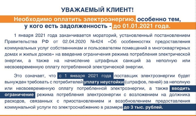 С наступлением нового года заканчивается мораторий, установленный Правительством России на введение ограничения режима потребления энергии, а также на начисление штрафов за неполную или несвоевременную оплату электричества.
