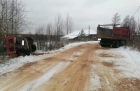 ДТП произошло накануне в деревне Окулихе Сокольского района. Как рассказали в областном управлении ГИБДД, 41-летний водитель самосвала потерял управление машиной. Грузовик занесло и он перекрыл дорогу. Но в тот момент по ней ехал грузовой, за рулем которого сидел 34-летний мужчина. От столкновения MAN вылетел в кювет и перевернулся. Водителя пришлось госпитализировать, сообщает ИА "СеверИнформ".