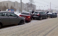 40-летняя водитель «Гетц» остановилась перед пробкой, но мужчина, который ехал следом на ВАЗ-2114 не рассчитал дистанция и врезался в иномарку. А потом уже в него влетел внедорожник «Фольксваген», за рулем которого находилась 37-летняя череповчанка. Далее уже в этот автомобиль в иномарку врезалась «Киа». Водитель «Шевроле», еще одного участника массового ДТП, все-таки успела затормозить, но в нее сзади въехала «Лада Калина» и от удара «Шевроле» откинуло на «Киа».
