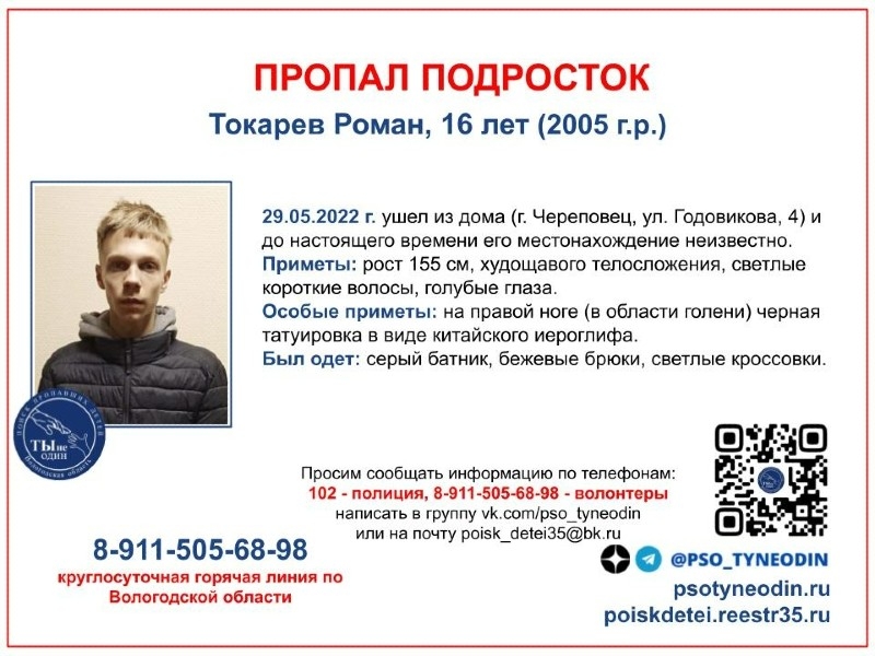 Приметы: рост 155 см, худощавый, волосы светлые, голубые глаза. На голени сделана тату в виде китайского иероглифа. Был одет в серый батник, бежевые брюки и светлые кроссовки.