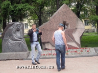 Люди в голубых беретах возложили цветы к памятнику в Октябрьском сквере