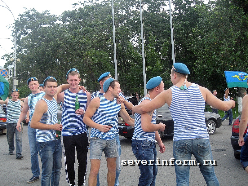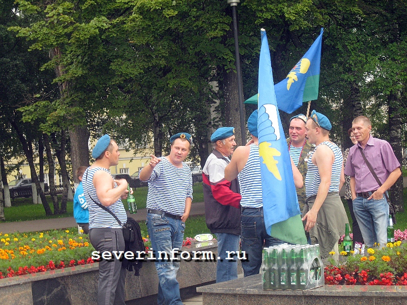 Вологодские десантники отмечают свой праздник. Люди в голубых беретах возложили цветы к памятнику в Октябрьском сквере. На протяжении всего дня ВДВшники ездят по городу с флагами. По традиции местами сбора «голубых беретов» стали площадь Революции, Соборная горка и парк ВРЗ. В праздновании принимают участие и семьи десантников. В этот день городской рынок работает. Но, как рассказывают очевидцы, никаких погромов не было.