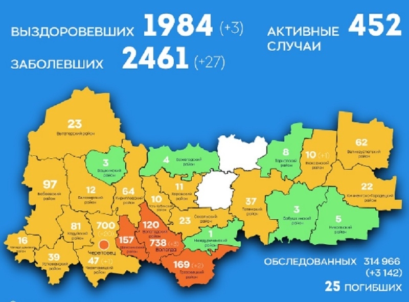 20 заражений пришлись на Череповец, 3 — на Вологду, 2 — на Грязовецкий район, по одному — на Нюксенский и Череповецкий районы. Всего с начала пандемии заболел 2461 человек. Поправились за сутки 3 пациента, общее число выздоровевших — 1984. Количество летальных исходов не изменилось — 25.