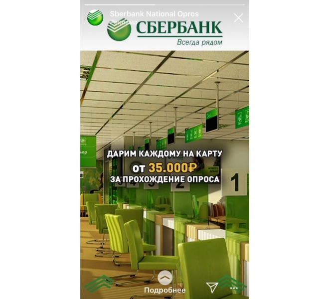 Злоумышленники действуют под видом «Сбербанка». У пользователя всплывает реклама в «Инстаграме» от имени «Sberbank National Opros». За прохождения опроса обещают 35 тысяч рублей (суммы и имена профилей могут меняться). Якобы компания «объявляет масштабный потребительский рейтинг», который составляется на основе мнения клиентов, а за участие платит деньги. Причем некоторым обещают увеличить выигрыш до 600 тысяч рублей.