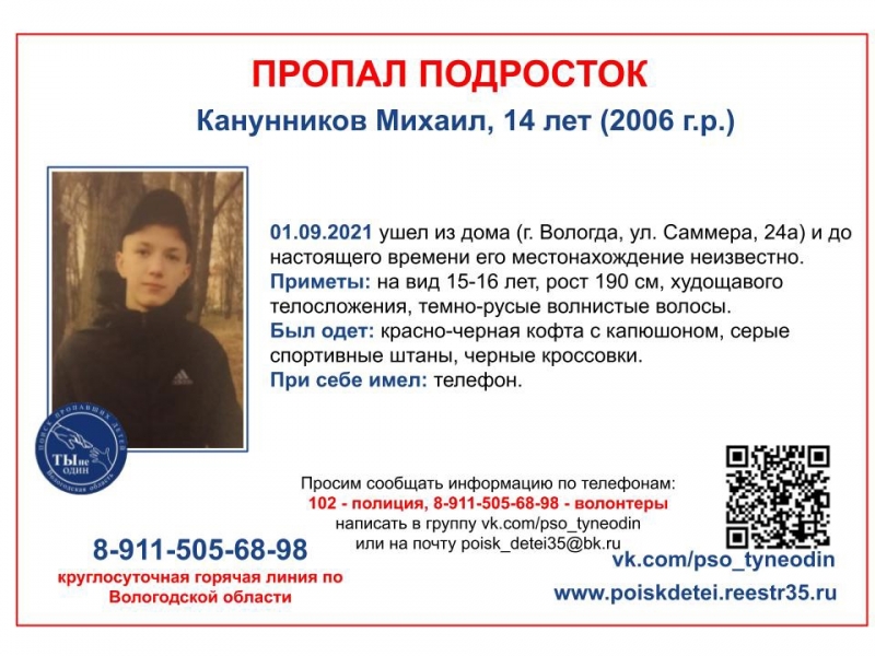 14-летний Михаил Канунников в День знаний ушел из дома на Саммера, 24А. Где сейчас находится подросток, неизвестно. ПСО «Ты не один» распространяет информацию о поиске.