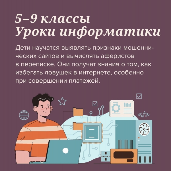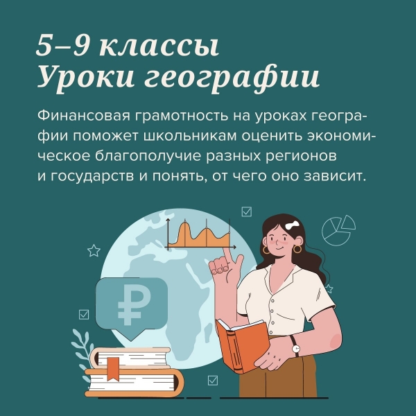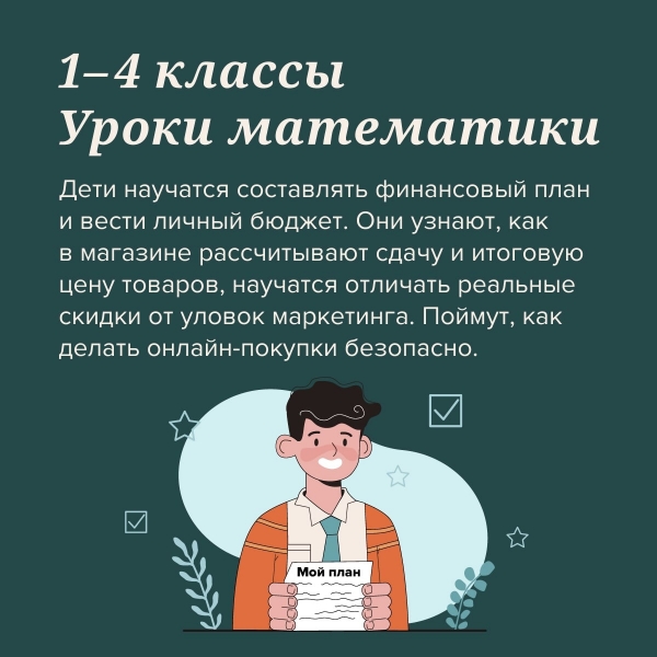 Вот, как это выглядит на практике. Часть практических математических заданий будет посвящена расчету цен товаров, стоимости покупок и услуг, налогов. Уроки географии дадут определения качества жизни человека, семьи и финансового благополучия. Грамотное поведение в интернете станет еще одним важным навыком, которому обучат школьников на уроках информатики.