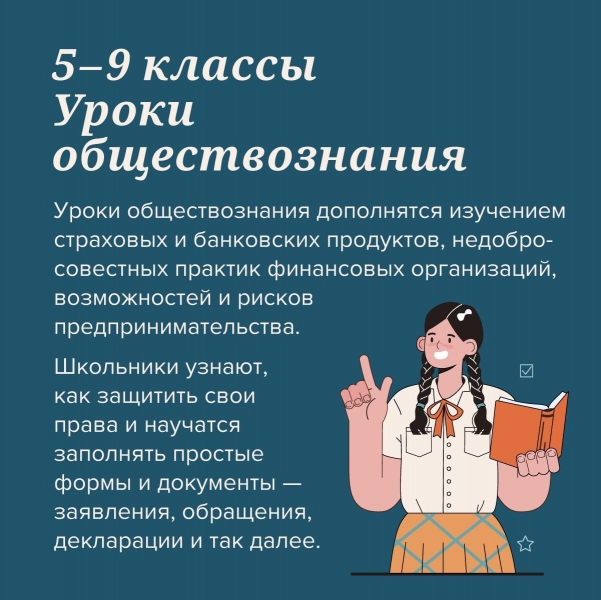 Занятия начались с 1 сентября. Это результат совместной работы Минпросвещения России, Минфина России и Банка России. Знания в сфере финансов интегрированы в базовые предметы: математику, окружающий мир, географию, обществознание, информатику. Школьники будут осваивать предмет, основываясь на жизненных ситуациях. Уже в младших классах ребята научатся анализировать доходы и расходы семьи, составлять личный финансовый план. В средней школе ребят научат разбираться в сути предпринимательства. Знания о различных видах мошенничества и недобросовестных практиках помогут им избежать проблем в будущем.