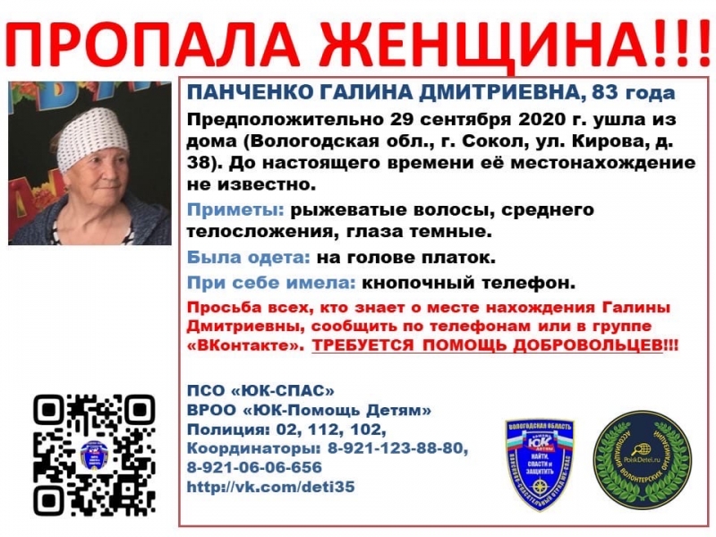 Галина Панченко живет в Соколе на улице Кирова, 38. Женщина нормального телосложения, с рыжеватыми волосами. С собой взяла кнопочный телефон.