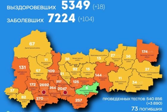 104 случая коронавируса выявлено за сутки на Вологодчине