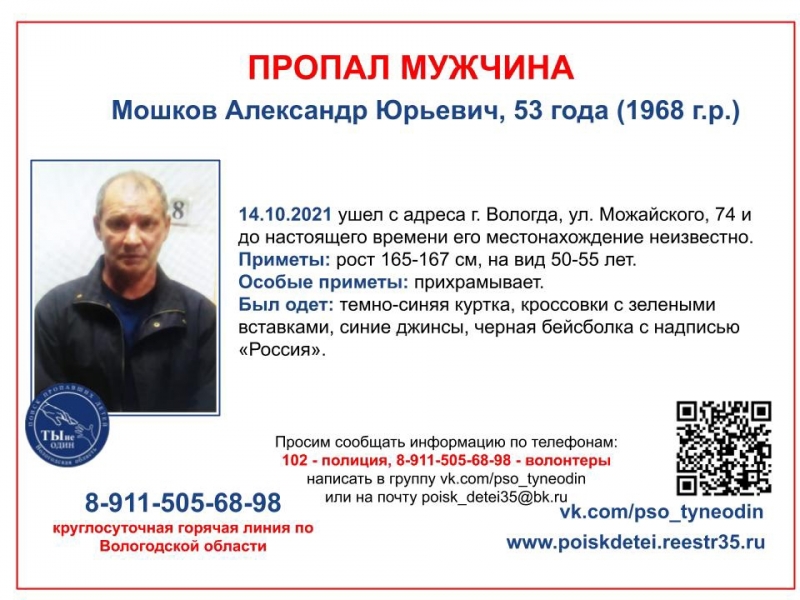 Вологжанин ростом около 165 сантиметров, выглядит на свой возраст. Из особых примет – немного прихрамывает. Был одет в темно-синюю куртку, кроссовки с зелеными вставками, синие джинсы, черную бейсболку с надписью «Россия».