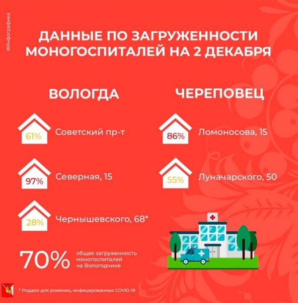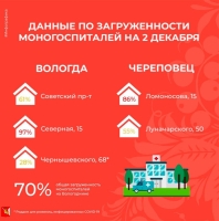 В Череповце в моногоспитале на улице Ломоносова, рассчитанном на 500 коек, занято на 86%. В моногоспитале на базе роддома свободна почти половина.