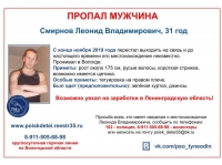 31-летний Леонид Смирнов перестал выходить на связь с родными ещё в конце ноября прошлого года. С тех пор его местонахождение неизвестно. Как сообщает ПСО «Ты не один», мужчина проживал в Вологде, но мог уехать на заработки в Ленинградскую область.