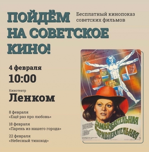 4 февраля можно увидеть Ирину Муравьеву в блистательной комедии «Самая обаятельная и привлекательная». 8 февраля вологжан ждут на показе картины «Еще раз про любовь». На 18 февраля назначен сеанс ленты «Парень из нашего города». 22 февраля зрители увидят «Небесный тихоход».