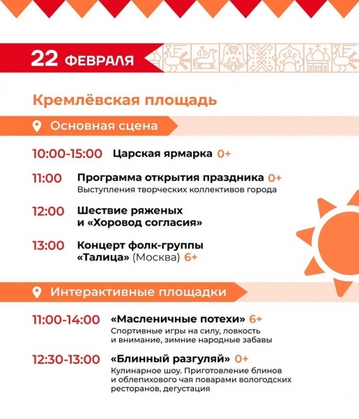 В полдень на площадь выйдет праздничное шествие и завершится большим народным хороводом. Одновременно пройдет мероприятие «Блинный разгуляй»: жители смогут попробовать бесплатные угощения, приготовленные шеф-поварами лучших ресторанов города, включая знаменитые вологодские блины и ароматный чай с облепихой.