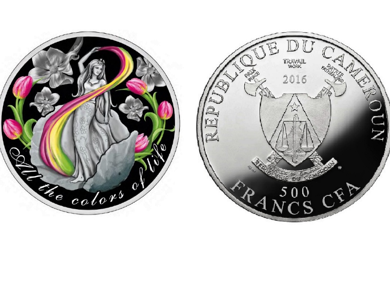 Монета выполнена в традиционной круглой форме. На реверсе монеты в центре изображена молодая женщина с разноцветной лентой в руках, создающей очертание цифры 8. Ниже по окружности имеются надпись на английском языке «Все цвета жизни». На заднем плане – орнамент из цветов.