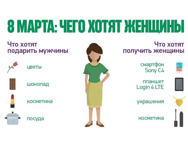 Как следует из целого ряда опросов, первые места в рейтинге предпраздничных ожиданий занимают отнюдь не цветы и конфеты – обладатели первых мест в перечне «мужских предложений». Таких пунктов, равно как и посуды, в женском «хит-параде» нет вовсе. Косметика, обычно стоящая в мужских рейтингах на третьем месте, присутствует, но не более как замыкающий пункт. Что и понятно: в косметических средствах большинство мужчин разбирается настолько хорошо, что лучше им выбор не доверять. Зато многие современные дамы с удовольствием получили бы в подарок полезный девайс – смартфон или планшет. В этой сфере как раз хочется положиться на мужчин, по традиции лучше ориентирующихся в технических характеристиках.