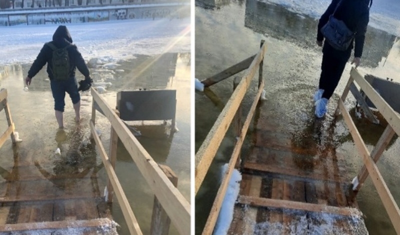 В Архангельске сегодня утром вода затопила ледовую переправу для пешеходов на Кегостров. Как сообщает 29.ru, жителям города пришлось переправляться на остров босиком или с пакетами на ногах. При этом в администрации Октябрьского округа, как пишет издание, отрапортовали, что переправа работает в обычном режиме, и лишь посоветовали архангелогородцам надеть непромокаемую обувь.