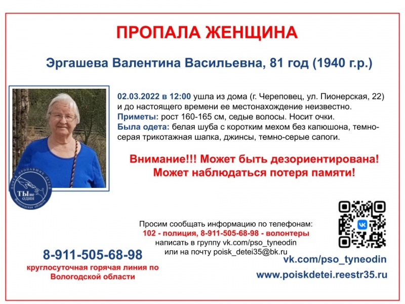 Напомним, пожилая женщина пропала 2 марта. Она имеет проблемы с памятью и может быть дезориентирована. Всем, кто увидит Валентину Васильевну, просьба сразу сообщить по телефону 8-911-505-68-98, сообщает ИА «СеверИнформ».