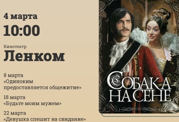 8 марта в "Ленкоме" покажут фильм "Одиноким предоставляется общежитие". 18 марта в программе картина " Будьте моим мужем". Завершит мартовские показы комедия "Девушка спешит на свидание".