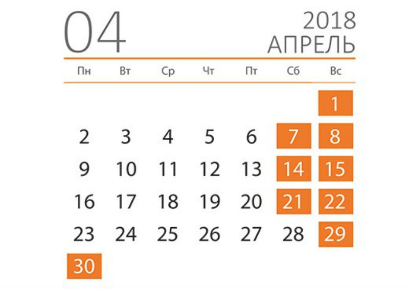 Из 30 календарных дней апреля 21 будет рабочий и 9 выходных. Дополнительных дней отдыха в апреле не предусмотрено.