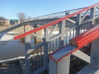 Пешеходный мост через реку обвалился в мае. В течение почти двух месяцев он стоял в неизменном виде. За это время были разобраны входные пролеты на него и прикрыта щитом дыра в покрытии. Работа по ремонту сооружения началась после Дня города. Восстановлением моста занимался ООО «СК Новый дом».