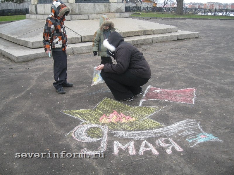 Через некотрое время к детям присоединились и прохожие, которые рисовали поздравления на асфальте. Получившуюся открытку можно будет увидеть во Дворце Творчества детей и молодежи на улице Ленинградской. Там она будет висеть до 9 мая.