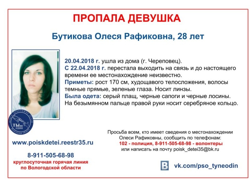 В Череповце полиция и волонтеры ищут без вести пропавшую девушку. По информации поисково-спасательного отряда «Ты не один», 28-летняя Бутикова Олеся Рафиковна ушла из дома 20 апреля, а с 22-го числа перестала выходить на связь, с тех пор ее судьба остается загадкой.