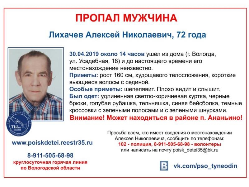 72-летний Алексей Лихачев 3 дня назад ушел из дома на Усадебной, 18 и пропал. Как рассказали волонтеры поисково-спасательного отряда «Ты не один», мужчина может находиться в поселке Ананьино.