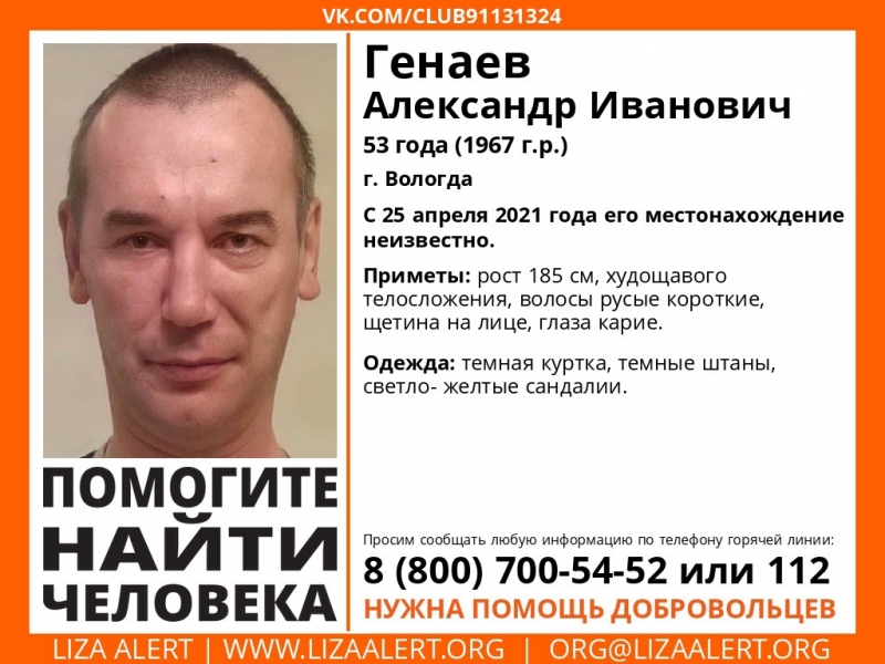 ПСО "Лиза Алерт" распространяет информаю о поиске 53-летнего Александра Генаева. Местонахождение жителя Вологды неизвестно с 25 апреля.