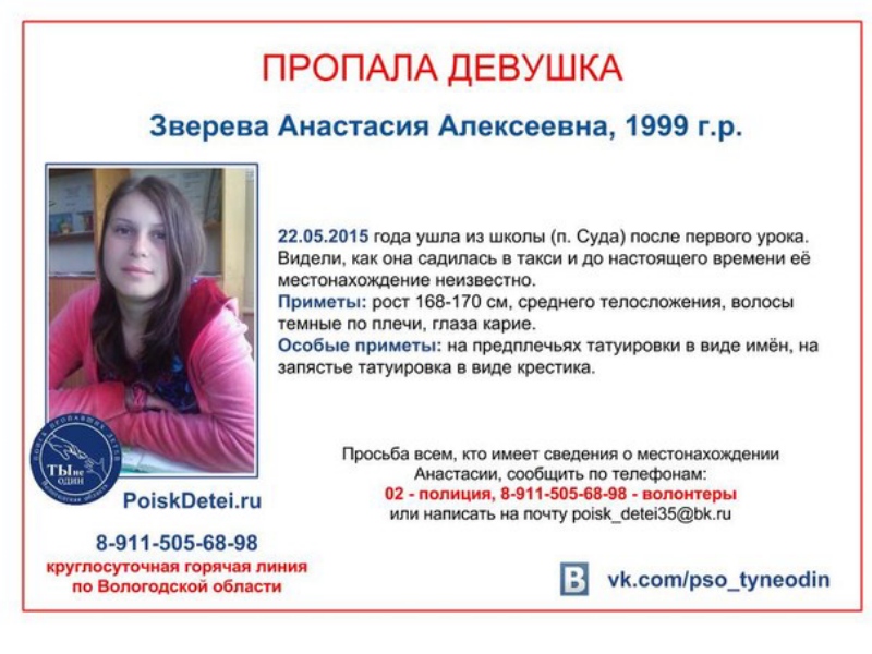 В поселке Суда Череповецкого района пропала 16-летняя девушка. Анастасия Зверева ушла из школы во время занятий еще 22 мая. Очевидцы заметили, что девушка села в такси и уехала. Больше о местонахождении школьницы ничего не было известно. Отметим, что Анастасия может находиться в Череповце.