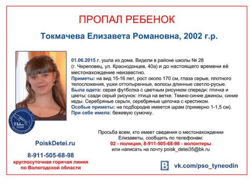 В Череповце пропала 13-летняя девочка. Елизавета Токмачева ушла из дома 1 июня. В последний раз ее видели рядом со школой №28, которая находится по адресу Краснодонцев,40а. С тех пор о пропавшей ничего не было слышно.
