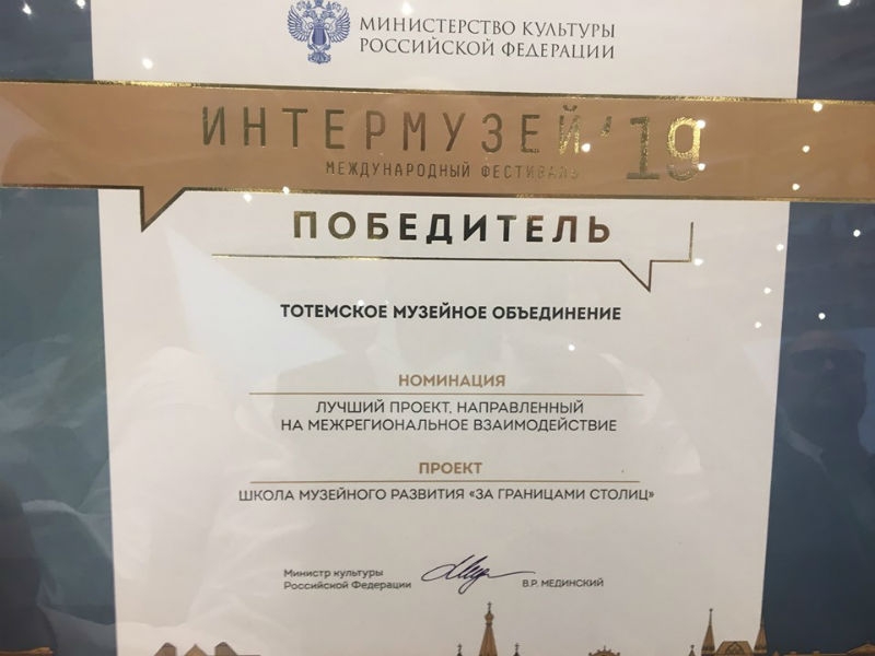 Награждение прошло в Москве. 19 раз главное событие музейной жизни страны собрало тысячи музейщиков со всей страны. На конкурс поступило 336 проекта от 213 российских музеев. В финальный отбор двадцати лучших проектов вошёл проект Тотемского музейного объединения «Школа музейного развития “За границами столиц”». С Тотьмой в номинации были Государственный Русский музей, Государственный музей изобразительных искусств имени Пушкина, «Петергоф» и Государственный Дарвиновский музей – крупные федеральные учреждения культуры.