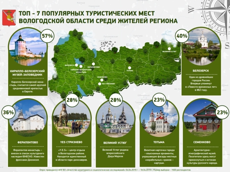 Исследование показало, что 57% вологжан уже побывали в Кирилло-Белозерском монастыре, сделав его таким образом самым посещаемым объектом. С небольшим отставанием идут Белозерск, Ферапонтов монастырь и родина Деда Мороза.