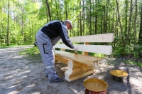 Лавки выполнены из оцилиндрованных бревен. Планируется покрыть материал антисептиком, чтобы дерево лучше переносило непогоду.