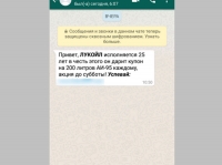 Текст смс одинаковый: «Привет, ЛУКОЙЛ исполняется 25 лет. В честь этого он дарит купон на 200 литров АИ-95 каждому, акция до субботы!»